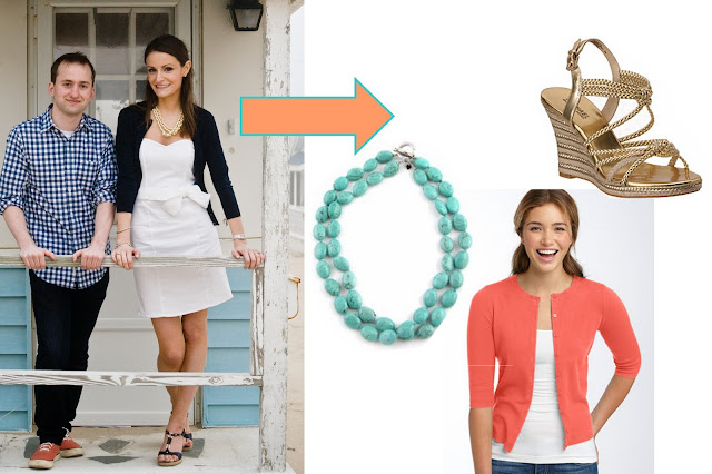 For the party, I’d change up the cardigan from navy to a bright coral, swap the pearls for a chunky turquoise necklace, and wear gold espadrille wedges instead of the navy ones, but it’s still the same basic outfit.